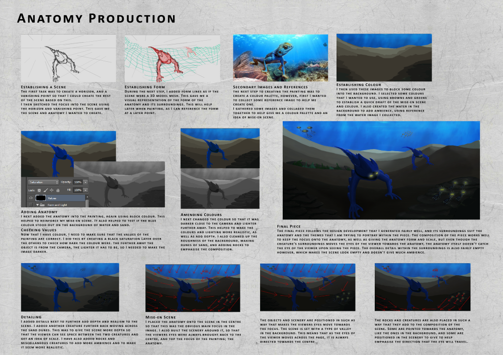 The anatomy concept art was an assignment for my college course. The aim was to create a piece of concept anatomy based on audience reasearch and inital designs and create a final piece showing our final anatomy design. We were also required to make spreads that showed our progress along the way.