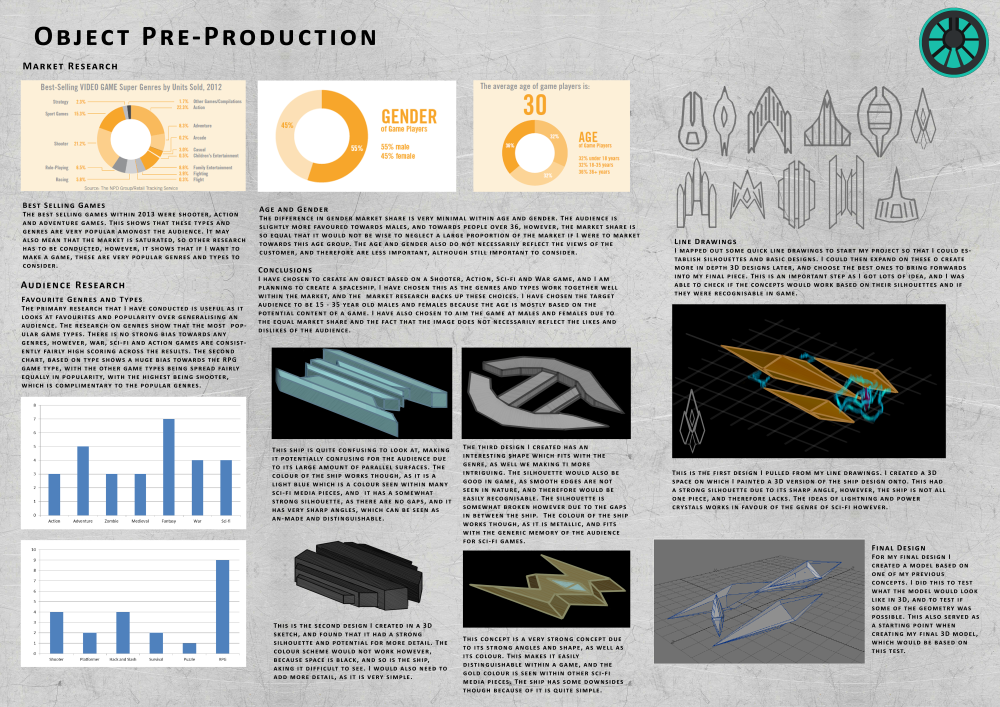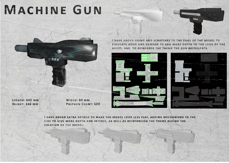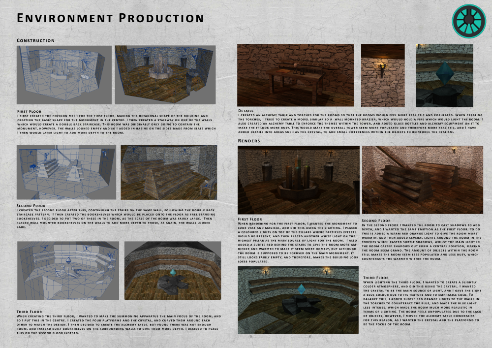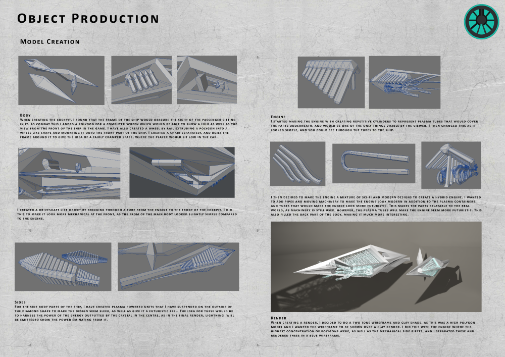 This is a compilation of three 3D models I created for the 3D modelling module during my time at college. The models were all created, textured and rendered by me, and the steps I went through during their creation are documented in the production spreads.